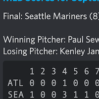 !<nhl/nfl/mlb/nba>scores <team/city> Today's scores. Scores by team and three letter codes work for MLB/NHL/NBA/NFL teams. If you don't put down a team it'll list every game for the day.